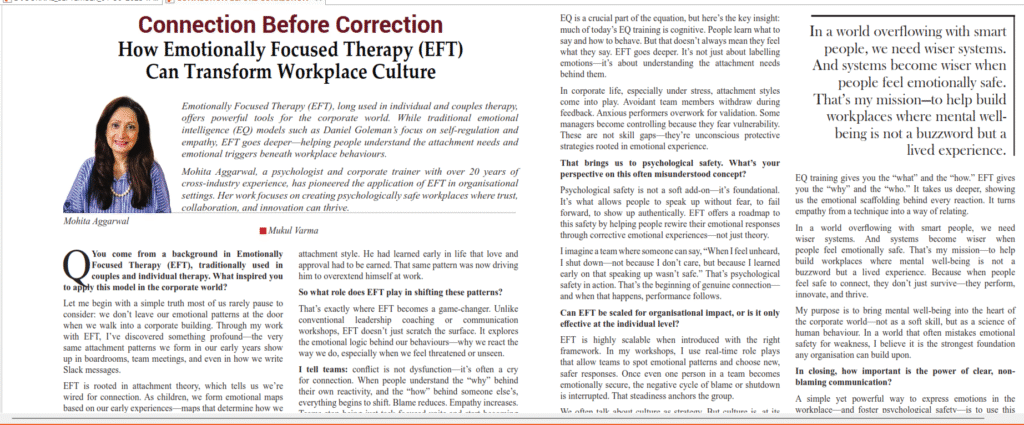 I’m thrilled to share that my interview with Mukul Varma, Senior Correspondent at Business Economics — a fortnightly business publication established in 1995, printed in Kolkata and distributed nationwide, with editorial offices in Kolkata and Chennai — has just been published. In this conversation, we explored how Connection Before Correction — a core principle of Emotionally Focused Therapy (EFT) — can transform workplace culture. Traditionally used in couples and individual therapy, EFT offers a science-backed, attachment-based framework that helps leaders and teams move beyond emotional intelligence as a “skill” to a deeper human connection. It provides practical tools to understand emotional triggers, build psychological safety, and create workplaces where trust, collaboration, and innovation thrive. I am proud to be the first to introduce EFT into the corporate world for enhancing psychological safety — helping organizations move from simply managing teams to truly leading human systems. Because when people feel emotionally safe, they don’t just work — they perform, innovate, and thrive.